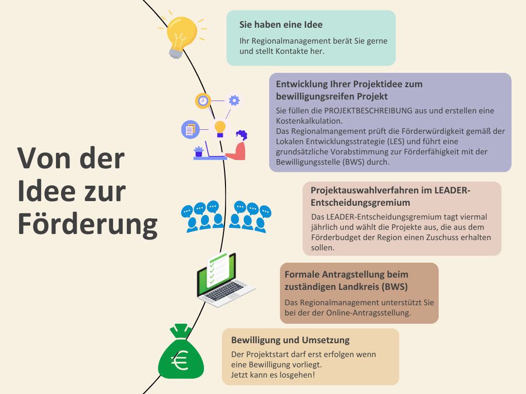 Das Regionalmanagement berät die Projektträger und prüft, ob das geplante Projekt in die Lokale Entwicklungsstrategie und mindestens einem Handlungsfeld passt. Das Regionalmanagement stimmt mit den Fach- und Förderberhörden der Landkreise Waldeck-Frankenberg und Marburg-Biedenkopf die Förderwürdigkeit des Projektes ab. Sofern das Projekt den Zielen der Lokalen Entwicklungsstrategie entspricht und förderfähig ist, kann es dem LEADER-Entscheidungsgremium (Vorstand) vorgestellt werden.
