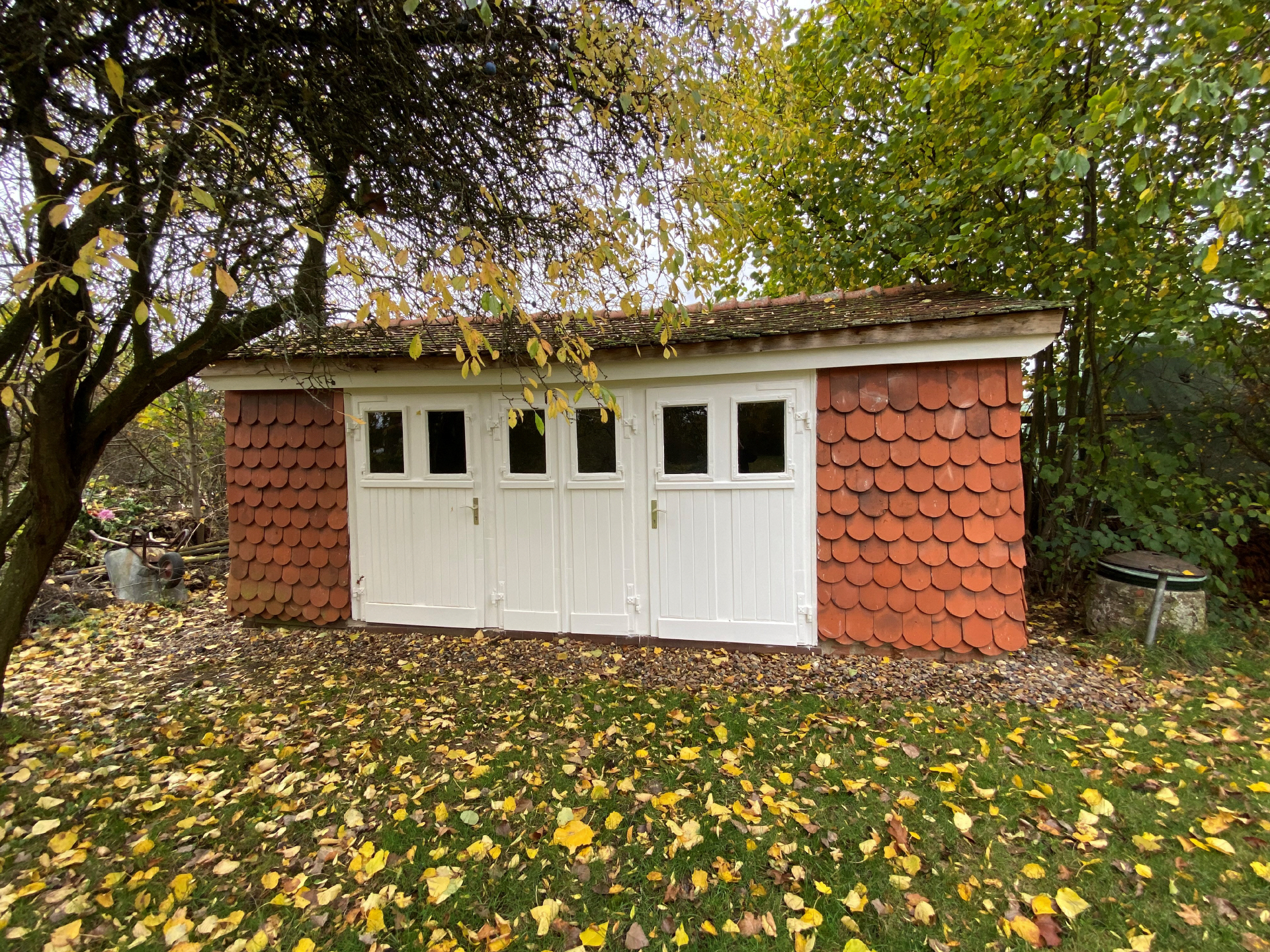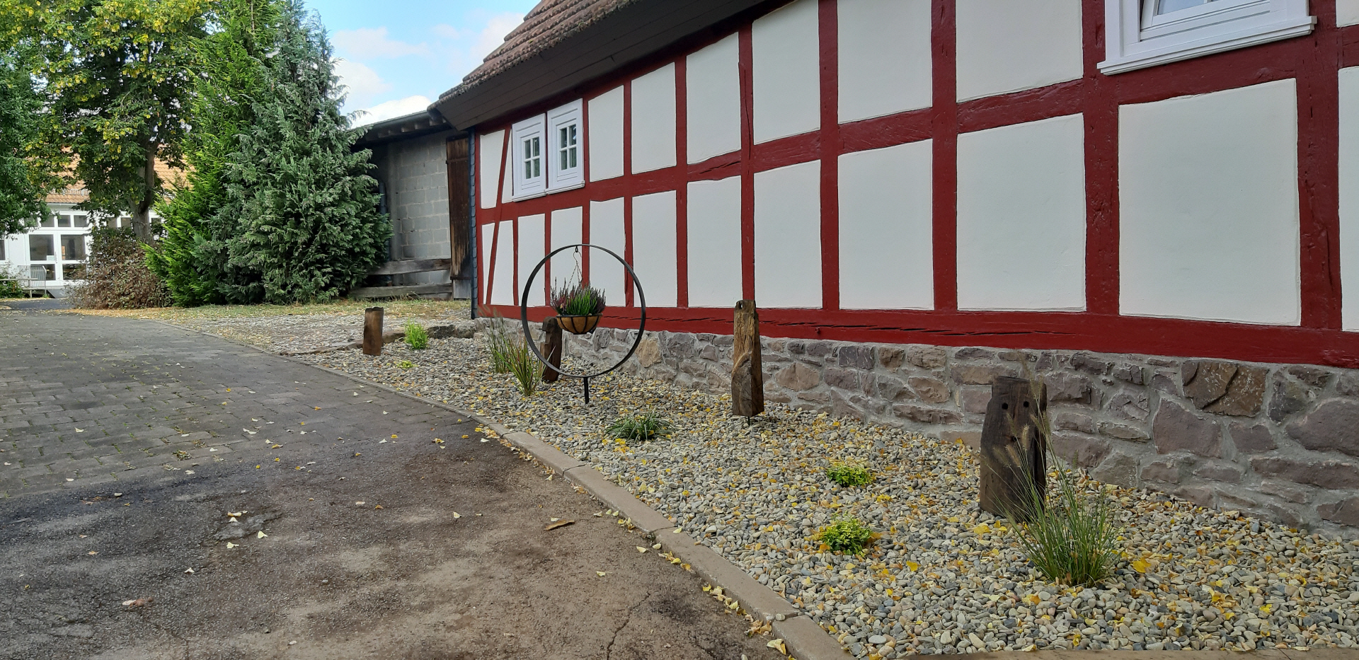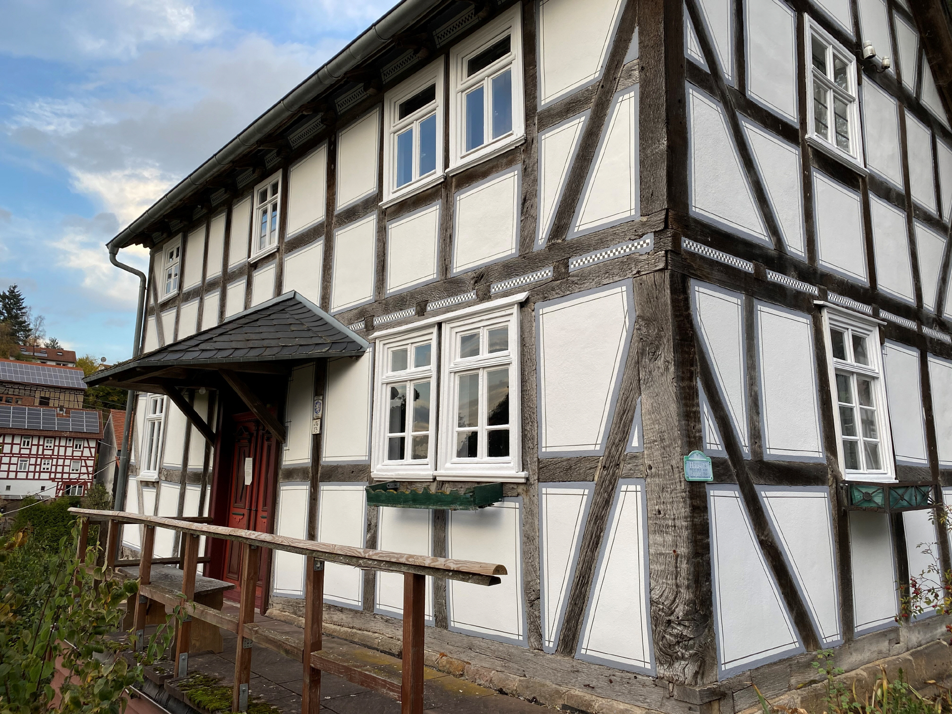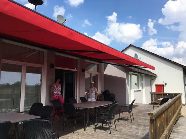 Vor einigen Jahren erfolgte im Zuge der Sicherstellung eines barrierefreien Zugangs der Bau der Terrasse. Insbesondere in den Sommermonaten finden Kaffeenachmittage, Familienfeiern oder Lesungen statt. Auf der Terrasse befinden sich die beliebtesten Sitzplätze. Seitdem die Kaffeenachmittage mit einer geführten Rundwanderung auf dem historischen Wanderweg verbunden werden können, kommen zahlreiche Besucher*innen, auch aus den umliegenden Gemeinden oder Marburg. Eingeladen wird in das sogenannte Wandercafé. Dieses Angebot wurde im letzten Jahr von Einzelwanderern sowie von Vereinen und Gruppen genutzt. Auf der Terrasse können Sitzmöglichkeiten für bis zu 80 Gäste angeboten werden. Die vorhandenen Sonnenschirme benötigen schon jetzt sehr viel Lagerplatz und reichen in den Sommermonaten nicht aus. Um allen Gästen ein schattiges Plätzchen anbieten zu können, wurde mit Unterstützung aus dem Regionalbudget eine Markise angeschafft und installiert. Aus diesem Grund wurde eine Markise ans Haus angebracht.